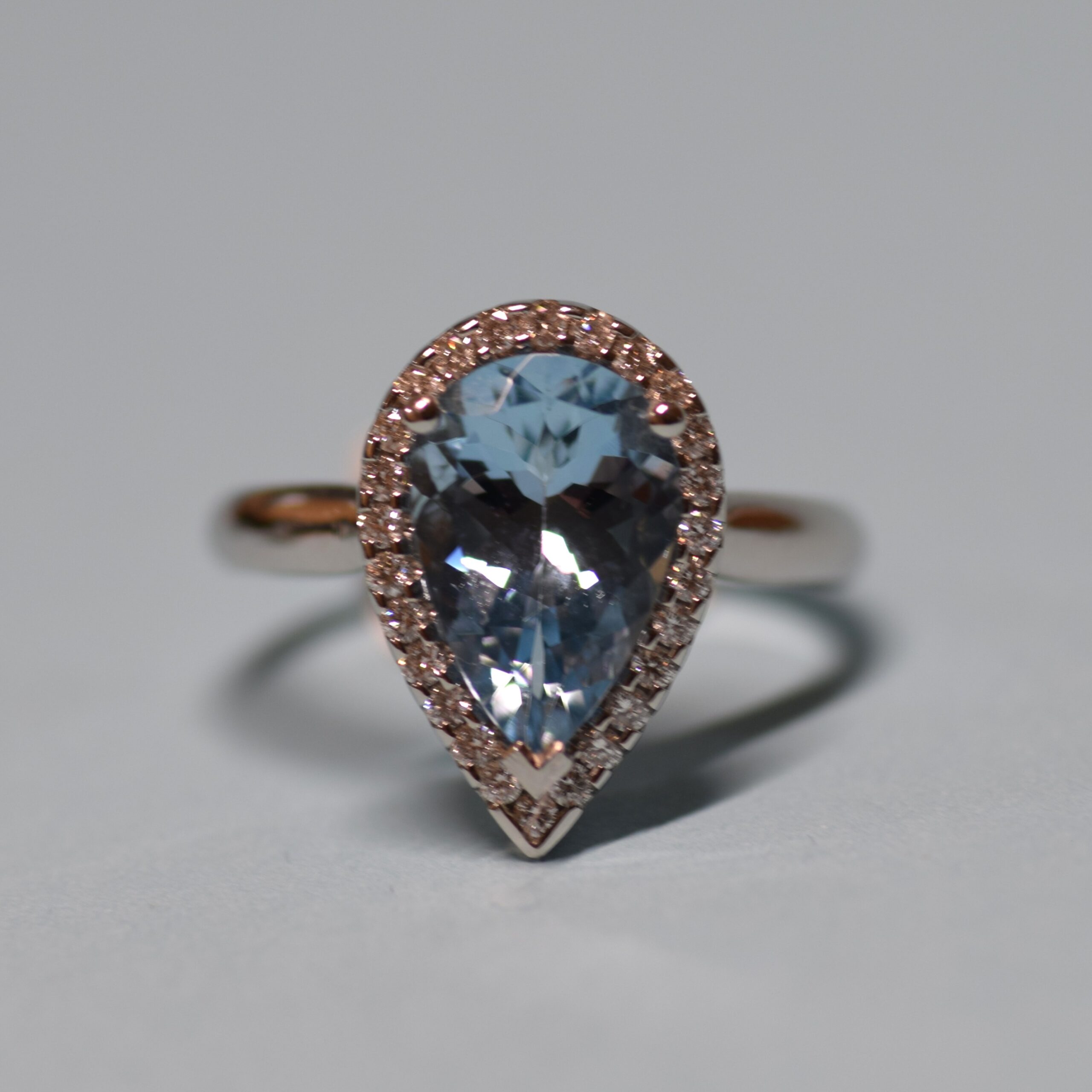 Crafted in Platinum , featuring a deep vibrant colour pear cut Aquamarine weighing 2.54ct. To compliment the beautiful gemstone is a halo of round brilliant cut diamonds weighing 26=0.26ct.