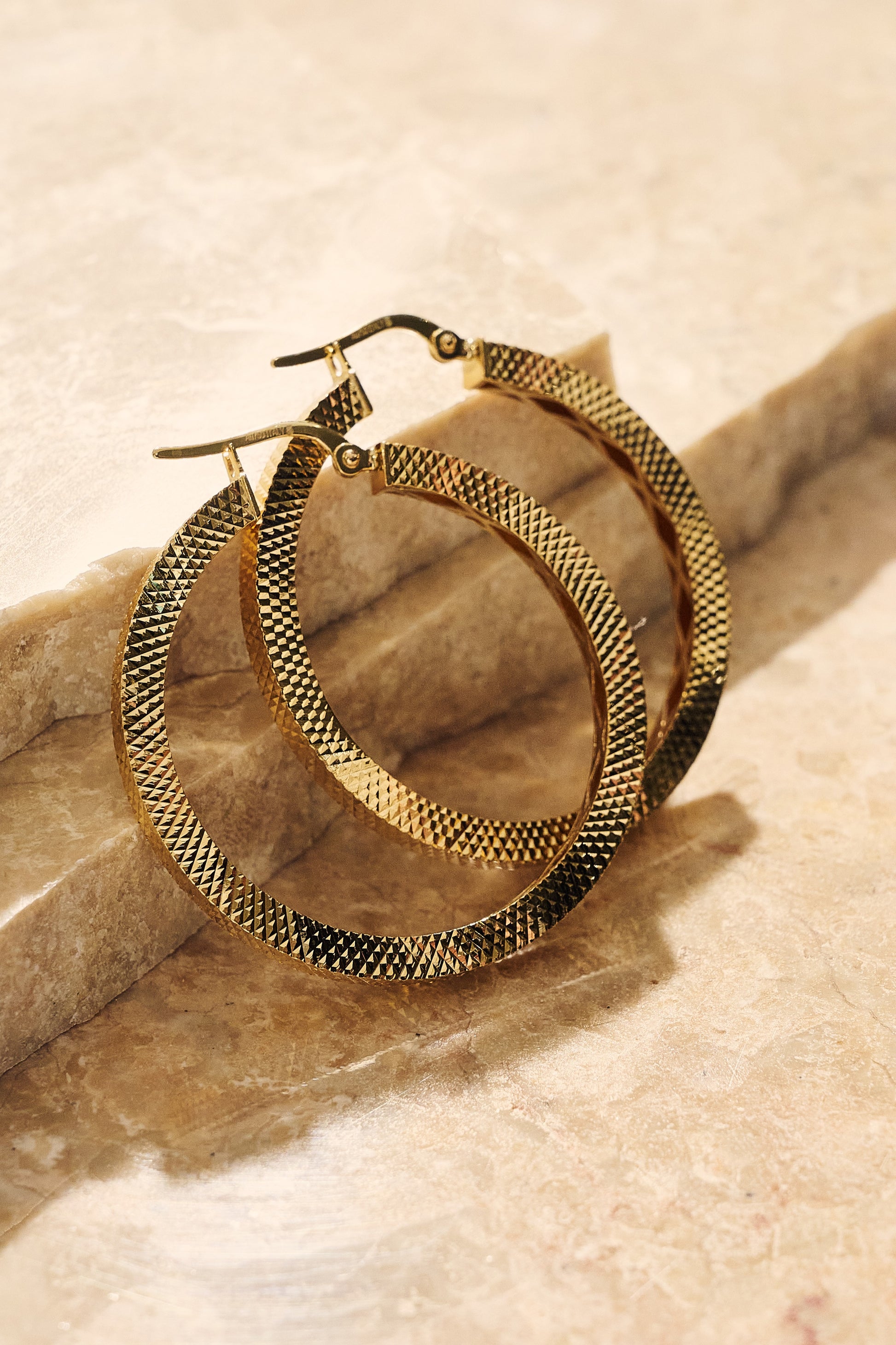 Crafted in 18ct yellow gold, these large textured hoops feature a refined diamond-cut finish that catches the light with every movement. Weighing 6.2 grams, their subtle shimmer and timeless design make them the perfect pair for effortless everyday elegance or refined evening wear.