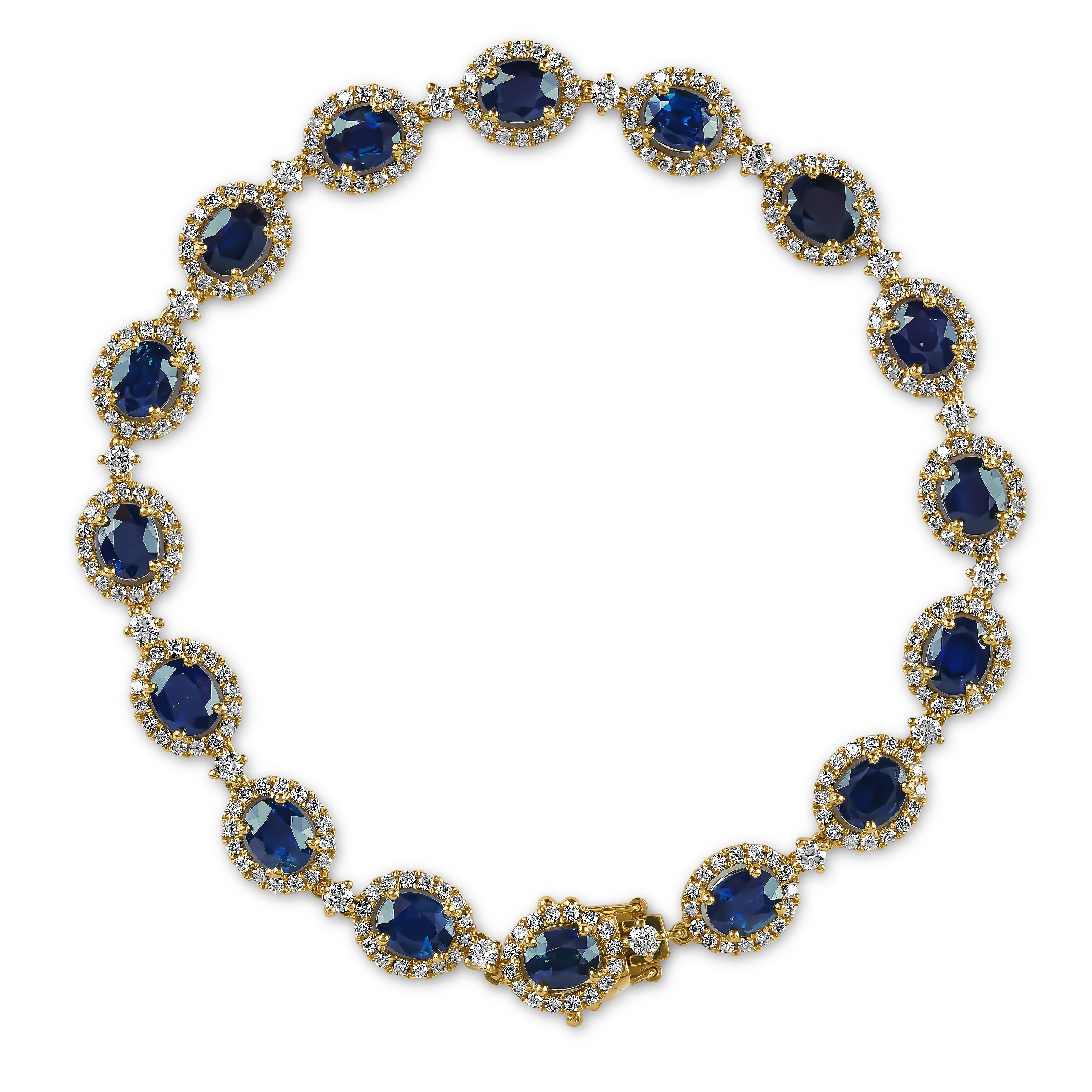 Crafted in 18ct yellow gold, this stunning bracelet features 16 oval-cut Australian sapphires totalling 3.02 carats, paired with 272 round brilliant cut diamonds weighing 1.75 carats. The combination of rich blue sapphires and sparkling white diamonds creates a captivating contrast that celebrates timeless luxury and refined craftsmanship.