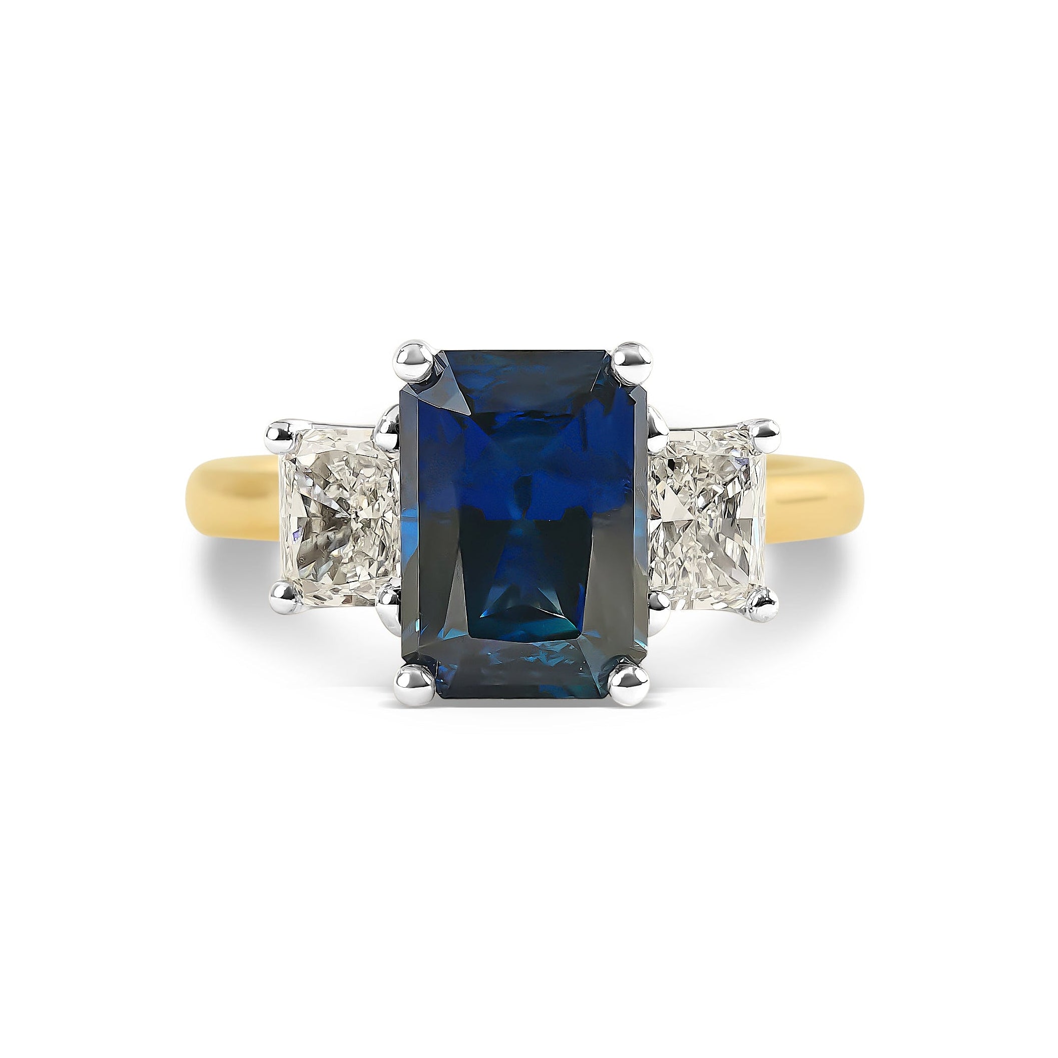 A striking celebration of colour and craftsmanship, this two-tone Sapphire trilogy ring features a vibrant 3.65ct Australian blue sapphire — its radiant cut capturing light with incredible depth and brilliance. The centre stone is perfectly balanced by two radiant cut diamonds, totalling 1.00ct (F colour /VS clarity), adding a timeless sparkle that enhances the sapphire’s rich hue.