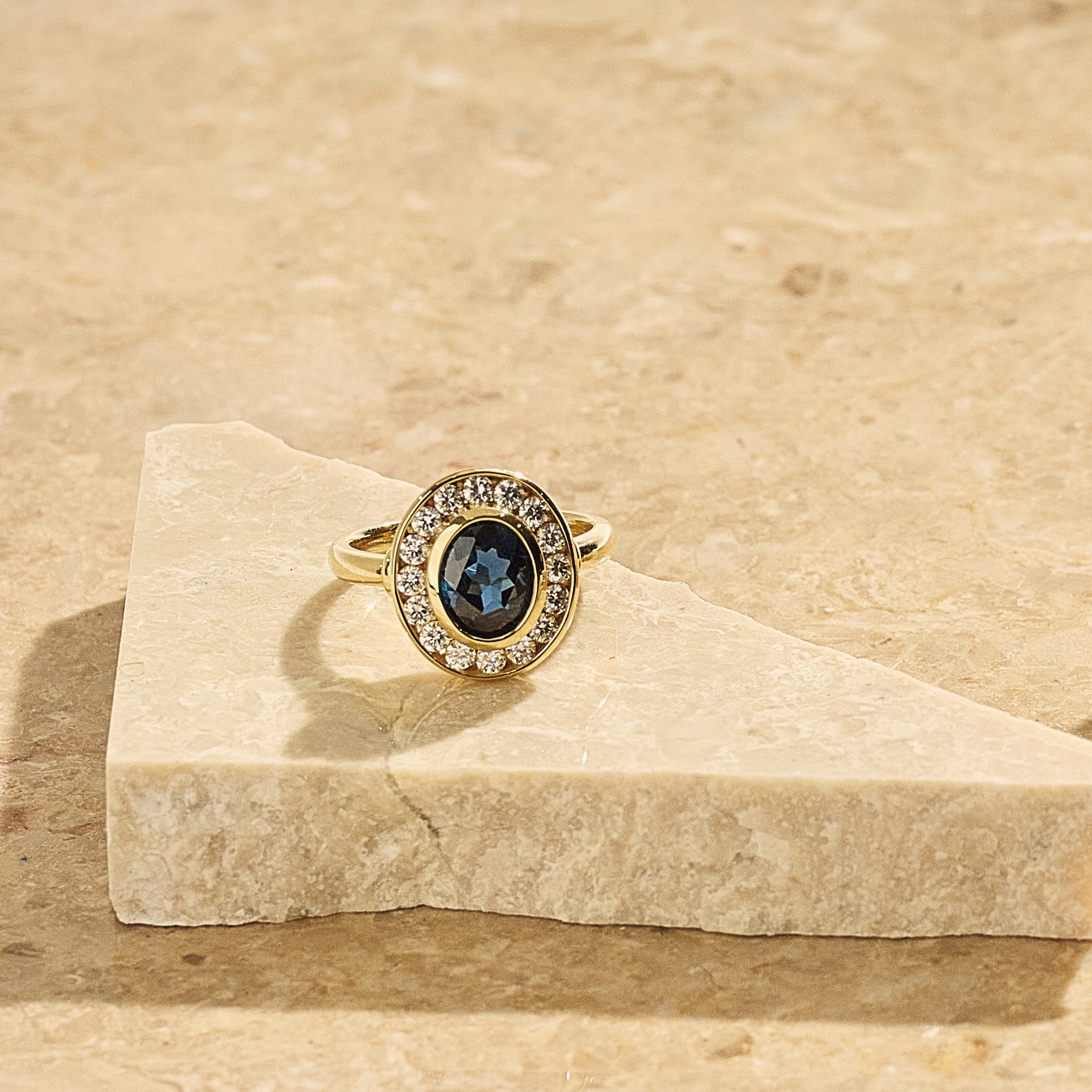 Featuring a 1.77ct oval-cut Australian sapphire in a deep, rich blue hue, this ring showcases timeless elegance with a modern twist. The sapphire is set in a polished yellow gold bezel, surrounded by a sunken channel halo of 16 round brilliant cut diamonds totalling 0.56ct. The unique design enhances both the colour and depth of the centre stone, creating a refined yet striking look.