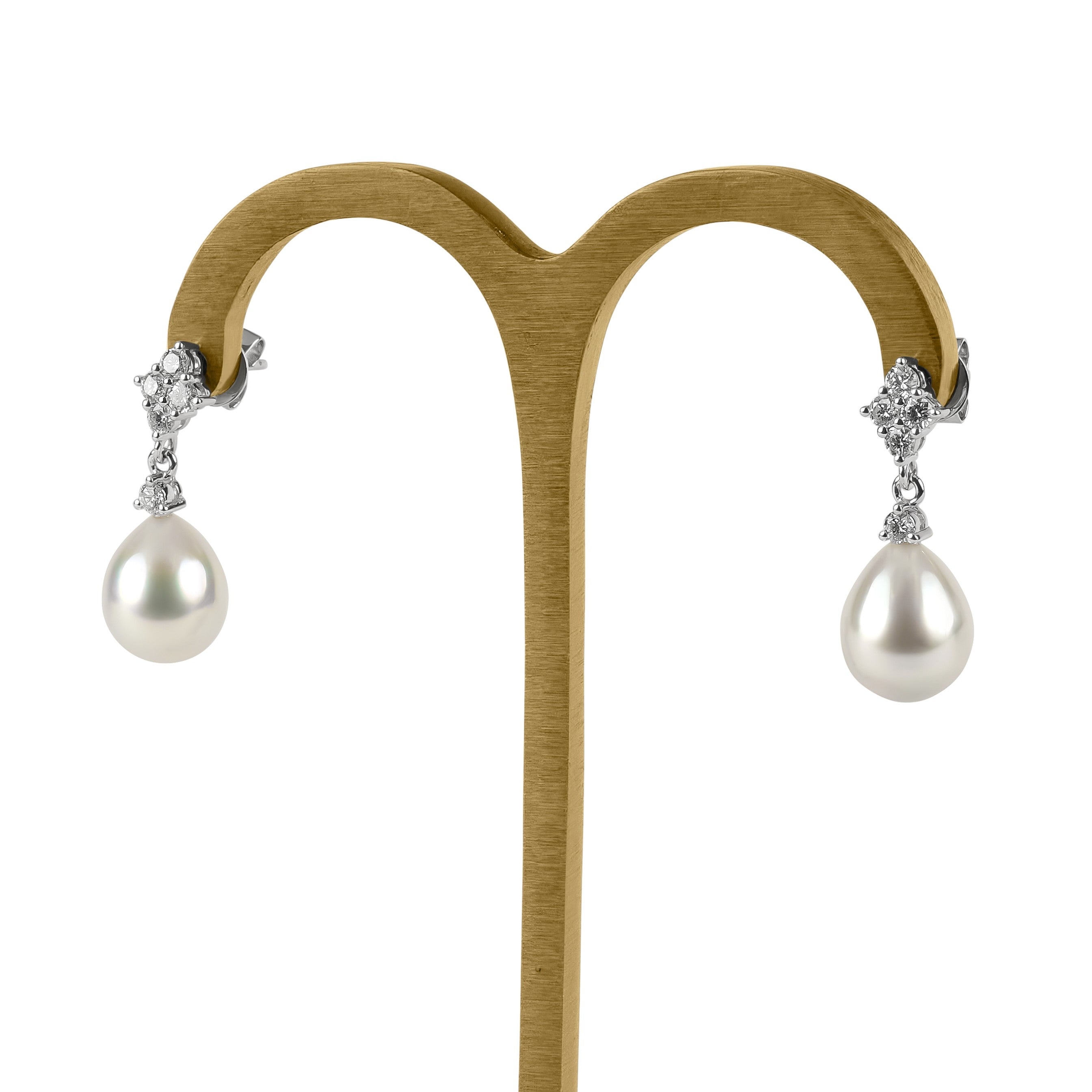 Crafted with refined elegance, these Australian South Sea pearl drop earrings showcase the natural beauty and unmistakable lustre of premium white pearls. Each earring features a radiant South Sea pearl suspended beneath a sparkling diamond arrangement. A round brilliant–cut cluster of four diamonds on the stud, complemented by a single diamond set delicately above the pearl for added light and movement.