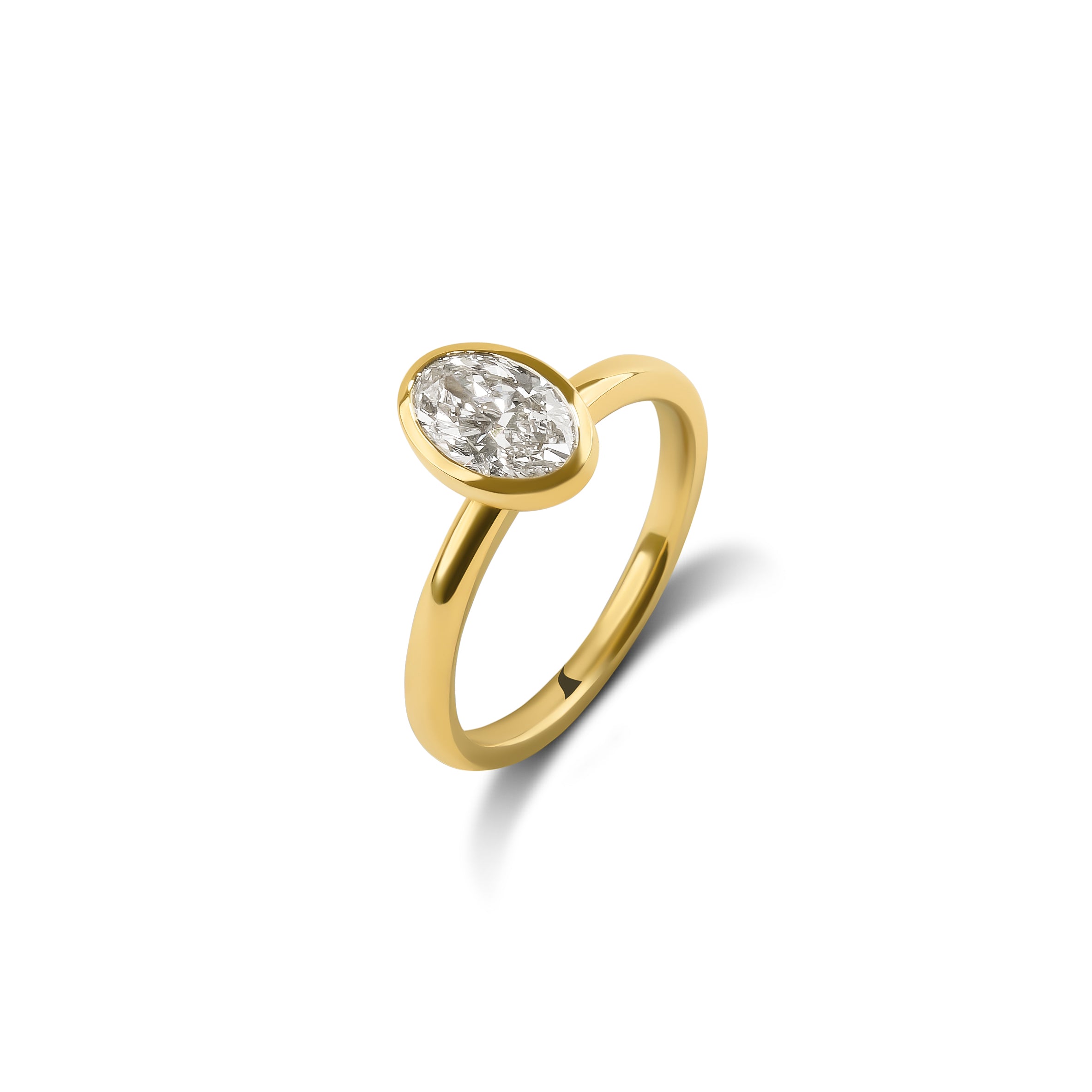 Crafted by our jewellers in 18ct yellow gold, this refined design frames a 1.01ct G VS1 GIA-certified oval diamond within a sleek bezel setting. The smooth golden contour enhances the diamond’s brilliance while offering a graceful, contemporary silhouette. A timeless expression of elegance — understated, radiant, and designed to be treasured for a lifetime. The rings features an under-rail allowing a wedding band to sit flush.