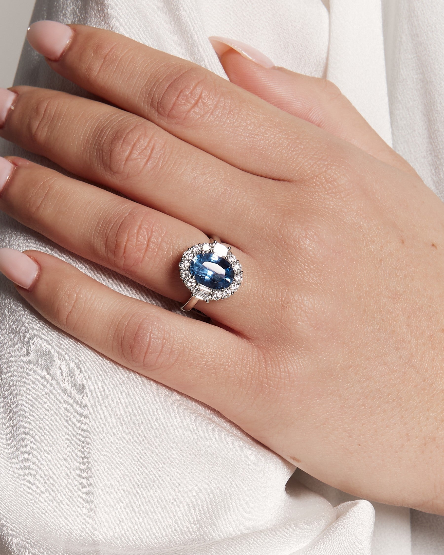 Commanding attention with its striking beauty, this ring features a 3.86ct oval-cut Ceylon Sapphire, celebrated for its deep, vivid blue hue. Surrounding the centre stone is a halo of emerald-cut diamonds (0.50ct total) and round brilliant-cut diamonds (0.67ct total, F/VS–SI1), creating a captivating play of light and dimension. Crafted in 18ct white gold and handmade in our Brisbane Arcade workshop, this exquisite design embodies timeless elegance and exceptional craftsmanship