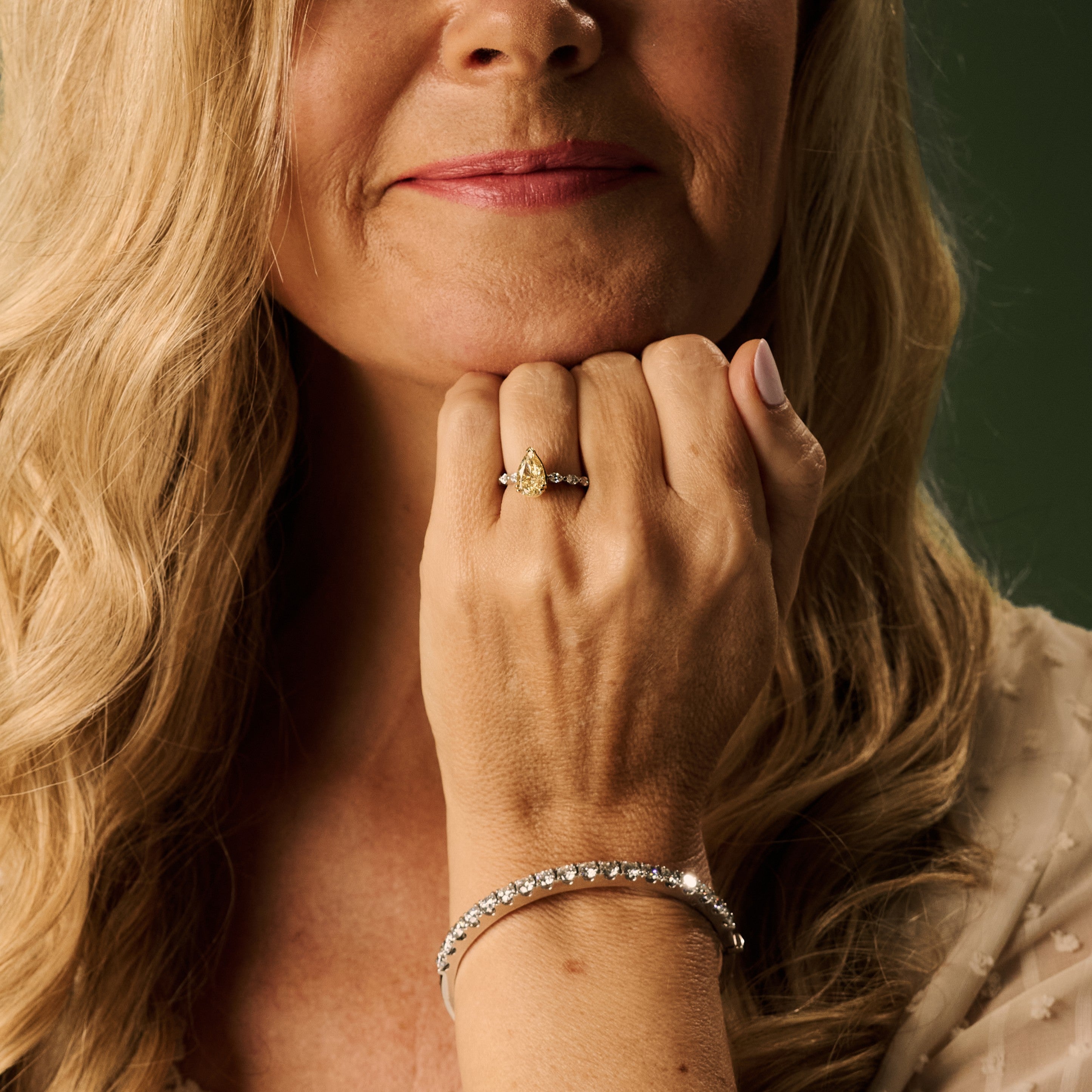 A striking 2.00ct Fancy Intense Yellow pear cut diamond takes centre stage in this luxurious design. Set in platinum, the vivid yellow diamond is enhanced by six marquise cut white diamonds totalling 0.37ct, creating a bold yet elegant silhouette that radiates brilliance from every angle.