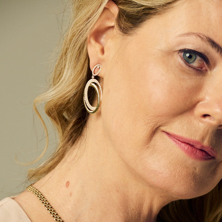 A striking pair of statement earrings featuring interlinking oval drops, beautifully crafted in 18ct yellow gold. Set with 160 round brilliant cut diamonds totalling 1.22 carats, these earrings radiate elegance and movement with every turn.
