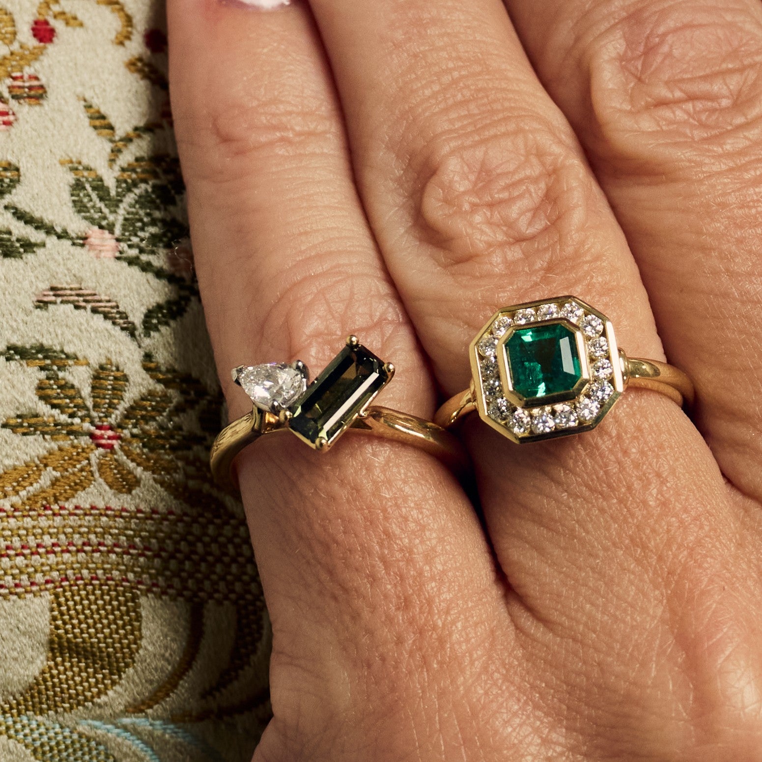A distinctive and contemporary Toi et Moi design featuring a captivating 1.16ct emerald cut green sapphire paired with a 0.30ct pear cut diamond (F/SI1). The striking contrast between the vivid green sapphire and the sparkling white diamond creates a beautifully balanced and modern aesthetic.