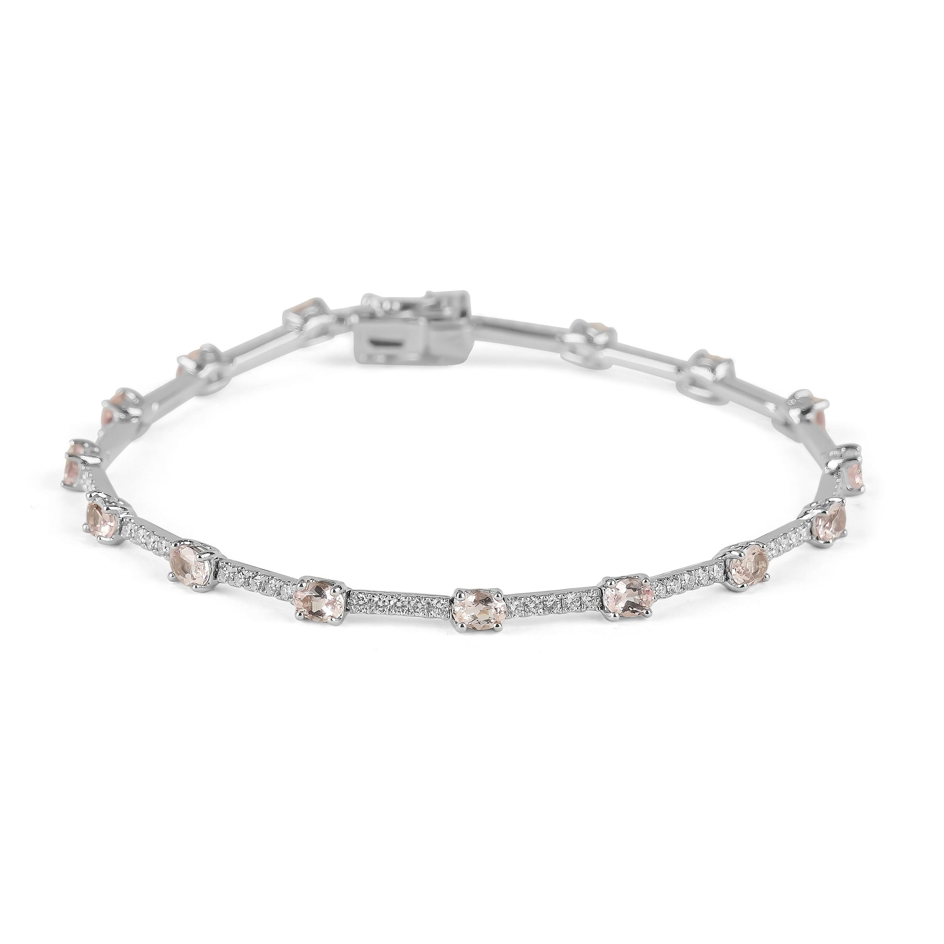 Delicately crafted in 18ct white gold, this elegant bracelet showcases 17 oval-cut Morganites totalling 2.48 carats, paired with 80 round brilliant cut diamonds totalling 0.82 carats of F/G SI1-2 quality. The soft blush tones of Morganite beautifully complement the sparkle of fine white diamonds, creating a sophisticated and feminine design that transitions effortlessly from day to night.