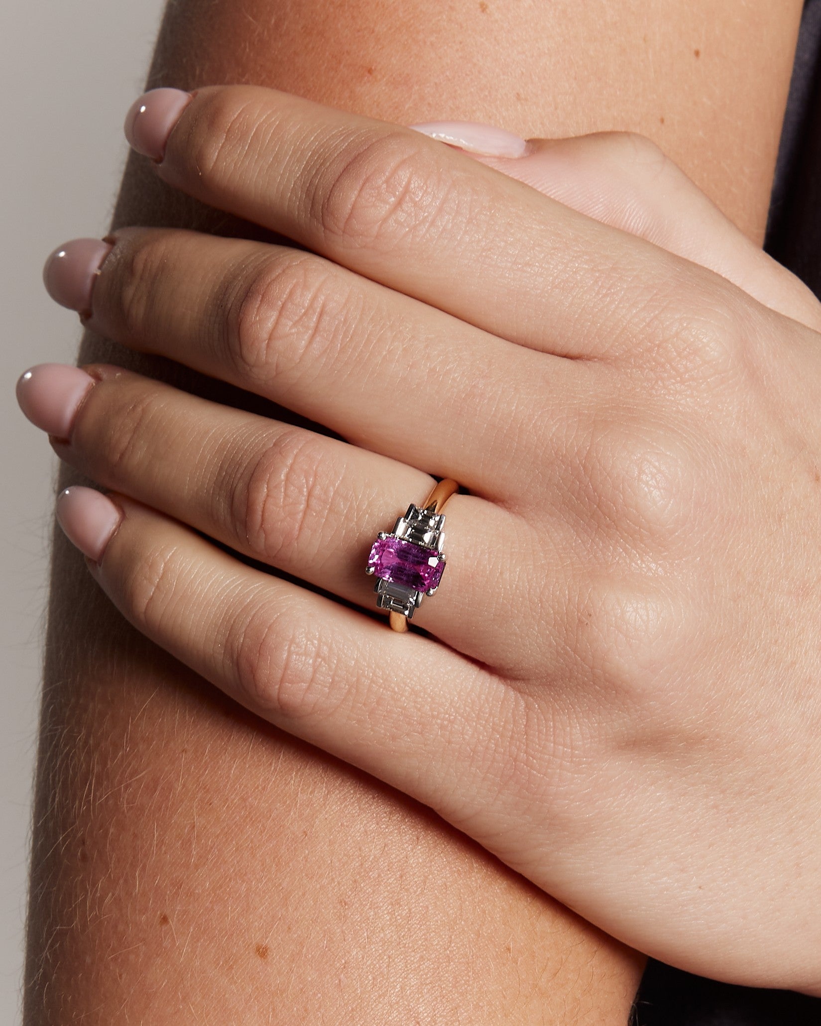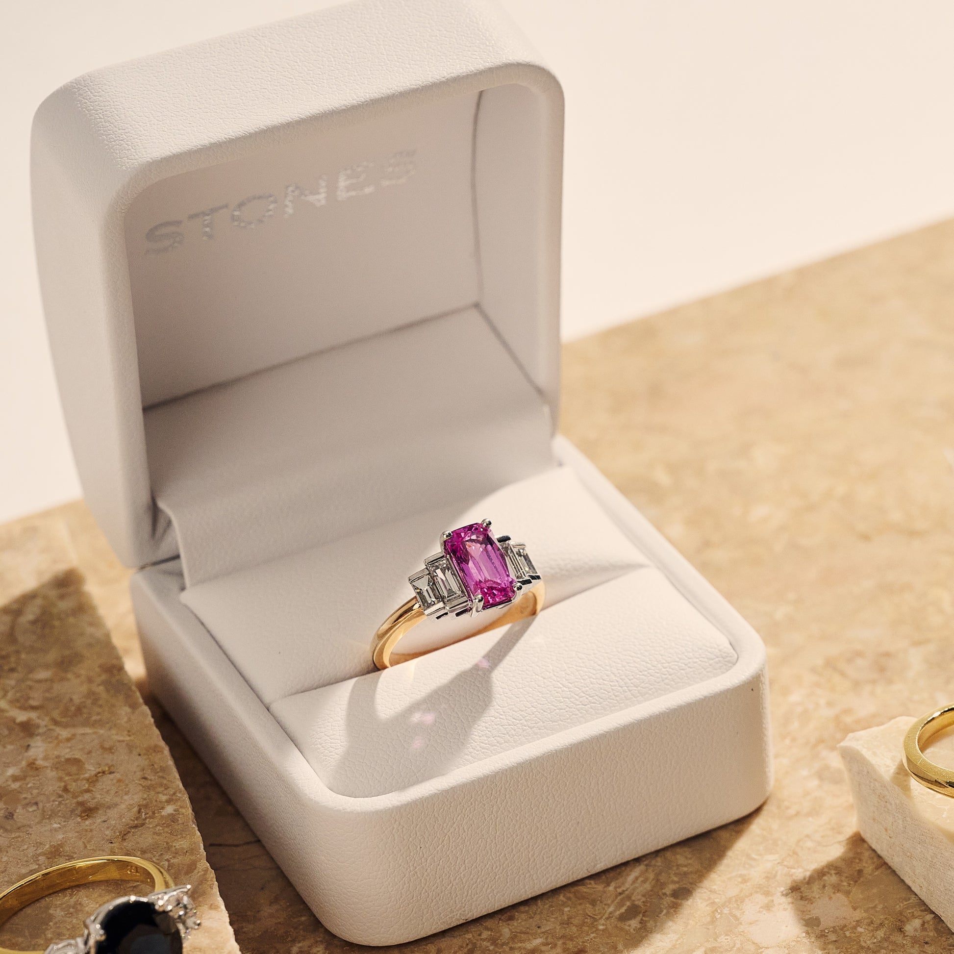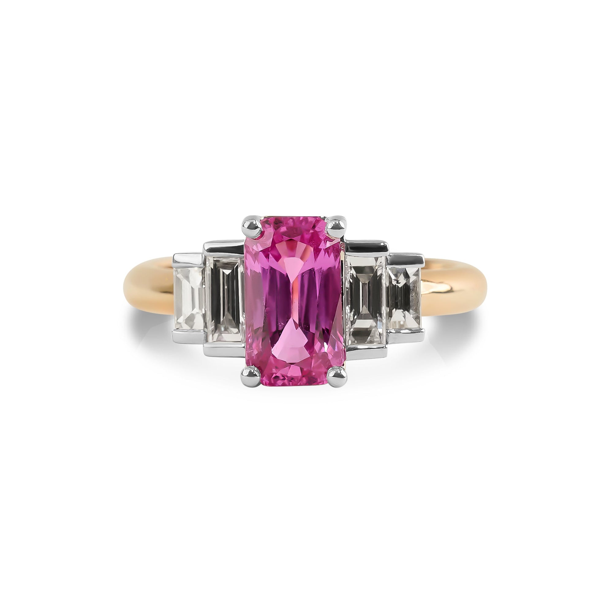 A stunning 2.41ct certified emerald-cut Pink Sapphire takes centre stage in this elegant design. Framed by baguette cut diamonds weighing 0.46ct total, the soft blush tones of the sapphire are beautifully complemented by an 18ct rose gold band and white gold setting. Handcrafted in our Brisbane Arcade workshop, this piece captures timeless beauty with a modern romantic touch.