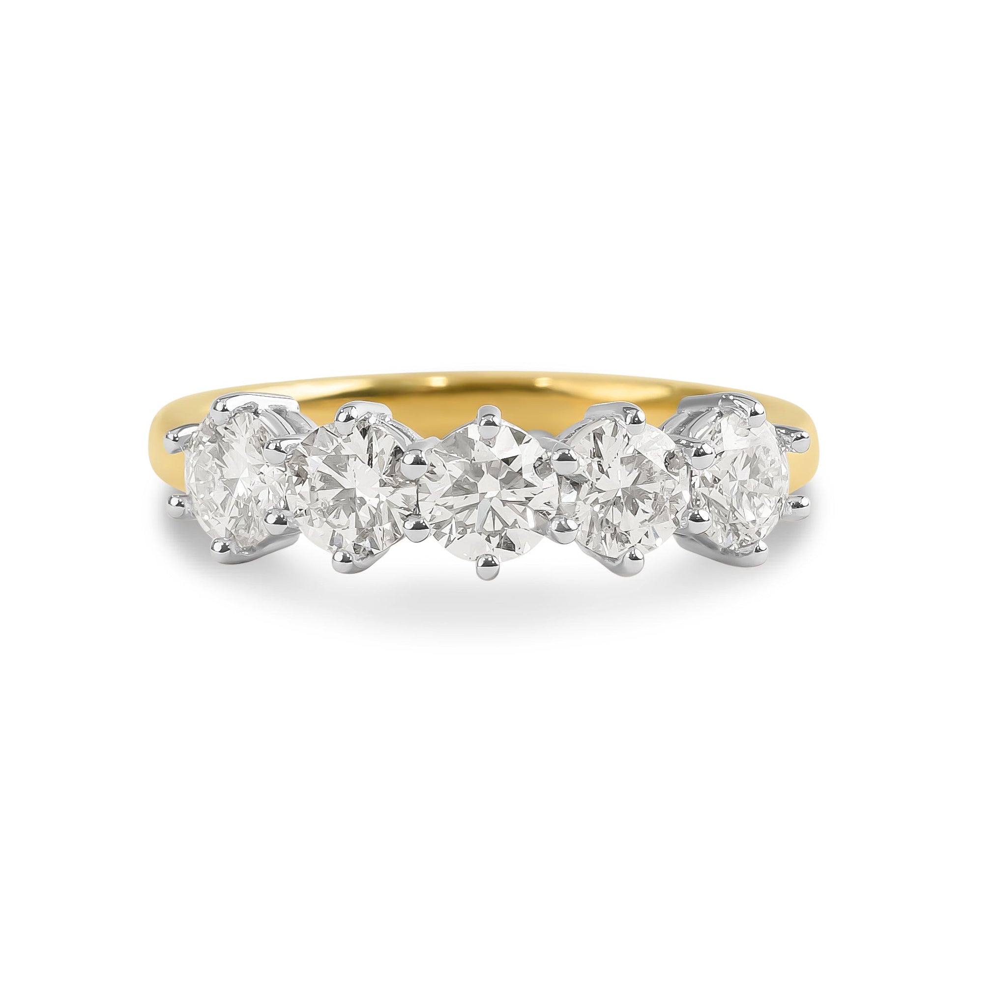 Crafted in 18ct yellow and white gold, this elegant five-stone diamond ring features 1.27ct of GIA-certified round brilliant cut diamonds F colour, VS2–SI1 clarity. Each diamond is securely held in a classic six-claw setting, creating a timeless design that radiates brilliance and sophistication — a perfect symbol of enduring love and elegance. Perfect for stacking with a engagement ring, a coloured gemstone rings, or for a anniversary gift.