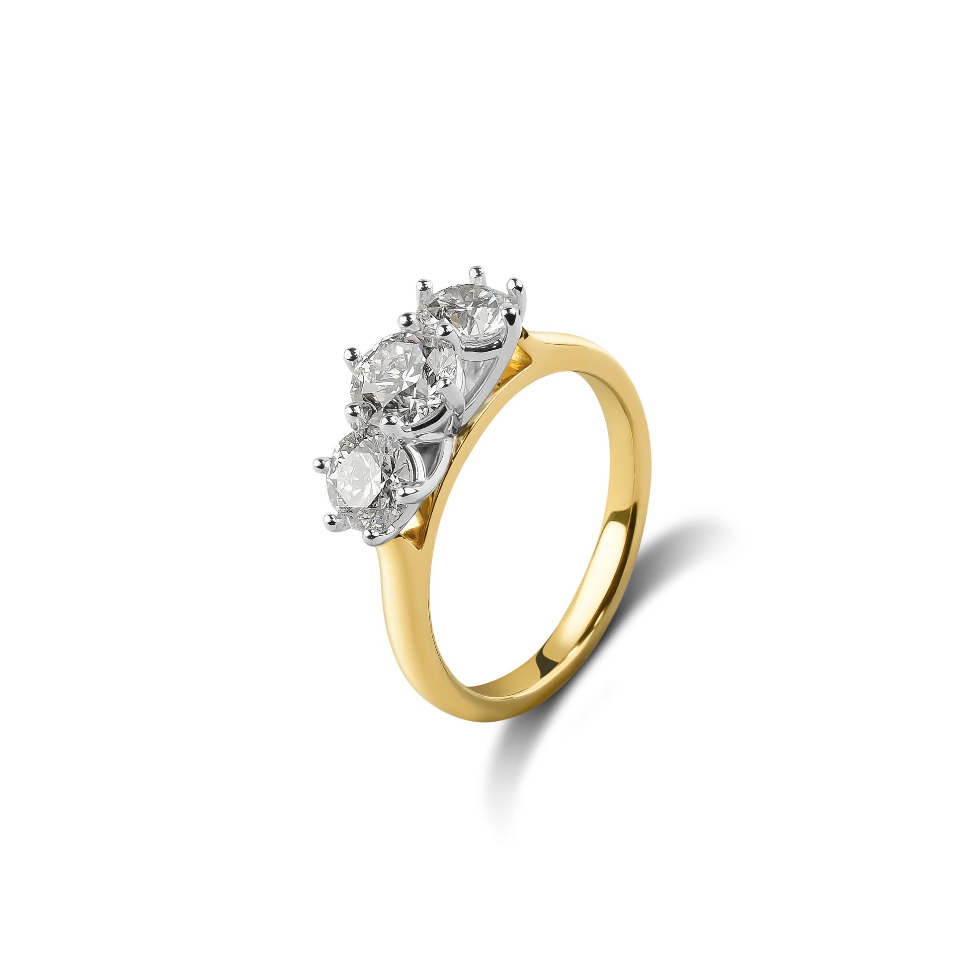 Crafted by our jewellers in beautiful 18ct Yellow & White Gold, this timeless diamond trilogy features a centre 0.70ct round brilliant cut diamond. Complimented with two 0.50ct round brilliant cut diamonds, weighing 2=1.00ct total, creating a sparkling display of diamond. This diamond trilogy is designed with a under-rail design allowing wedding and eternity rings to sit flush.